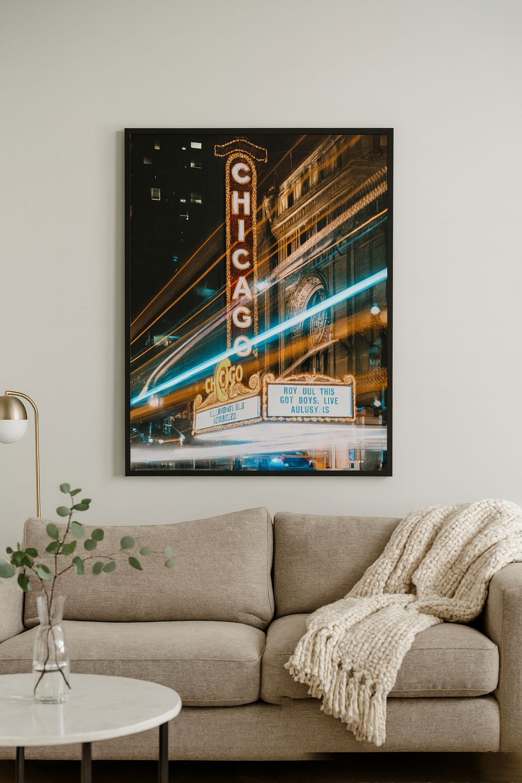 A long-exposure photograph of the famous Chicago Theater, capturing glowing light trails and the city’s vibrant nightlife energy.